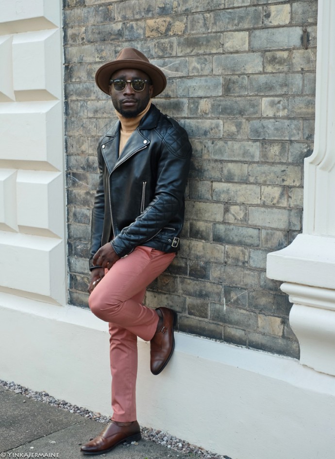 Biker Jacket- Kooples, Roll Neck- Topman, Trousers – Asos, Fedora Hat- Village hats, Monk Strap Shoes- Suitsupply,